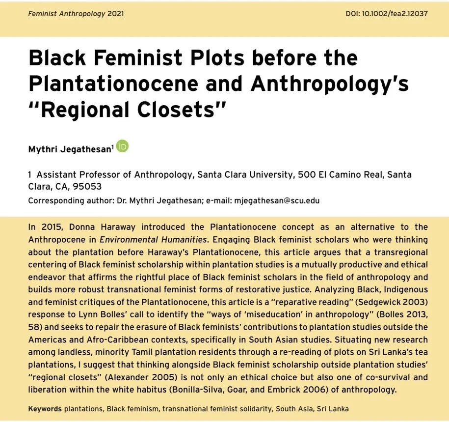 Jegathesan, Mythri. 2021. “Black Feminist Plots before the Plantationocene and Anthropology's “Regional Closets.” Feminist Anthropology, 2: 78-93. https://doi.org/10.1002/fea2.12037