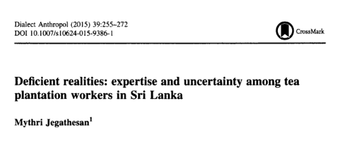 Jegathesan, Mythri. 2015. “Deficient realities: expertise and uncertainty among tea plantation workers in Sri Lanka.” Dialectical Anthropology 39: 255-272.